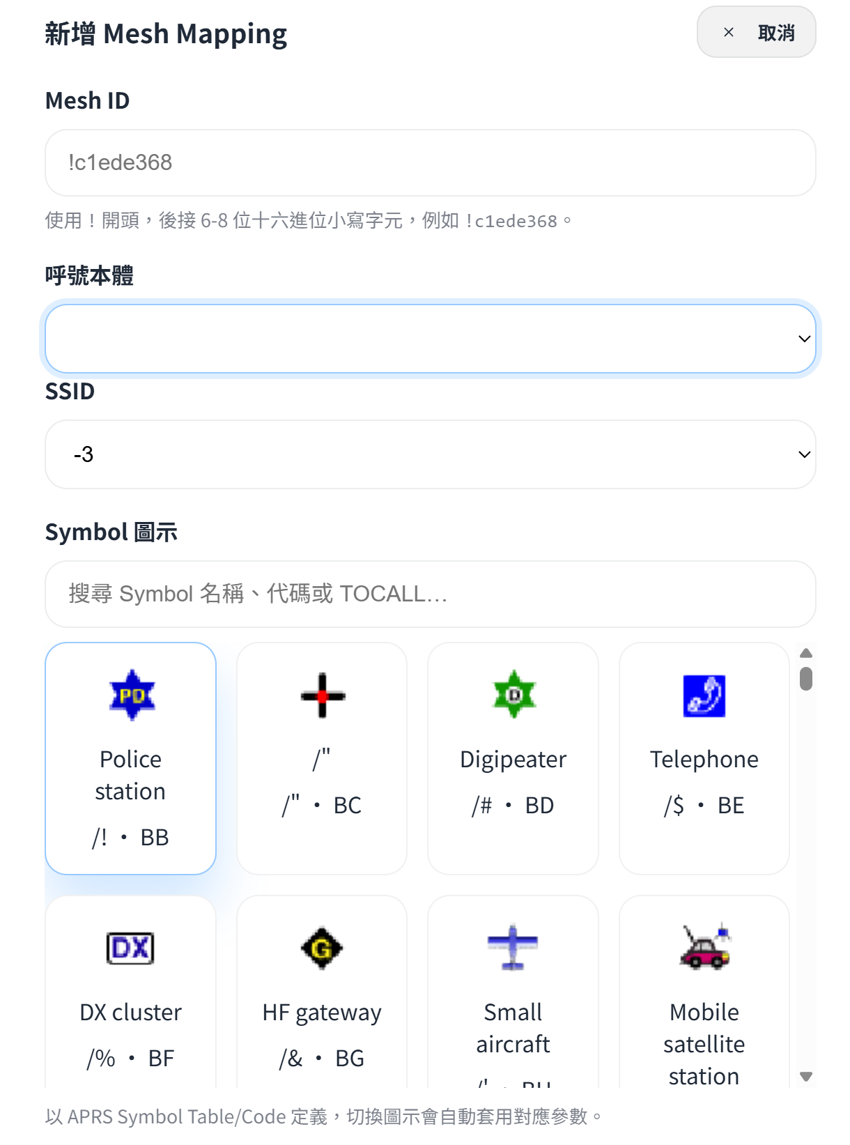 填入「MESH ID」、「SSID」 任選一個、「Symbol 圖示」選擇一個想要的圖案